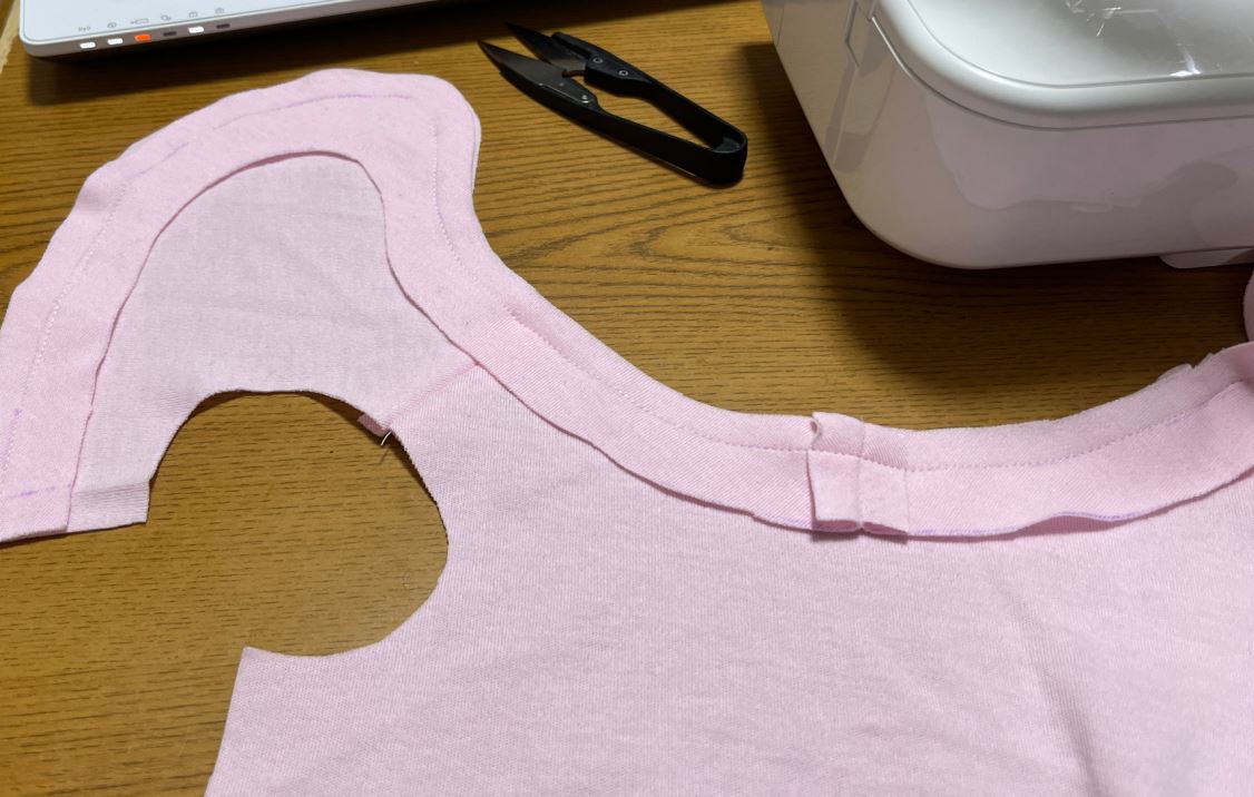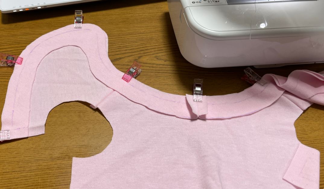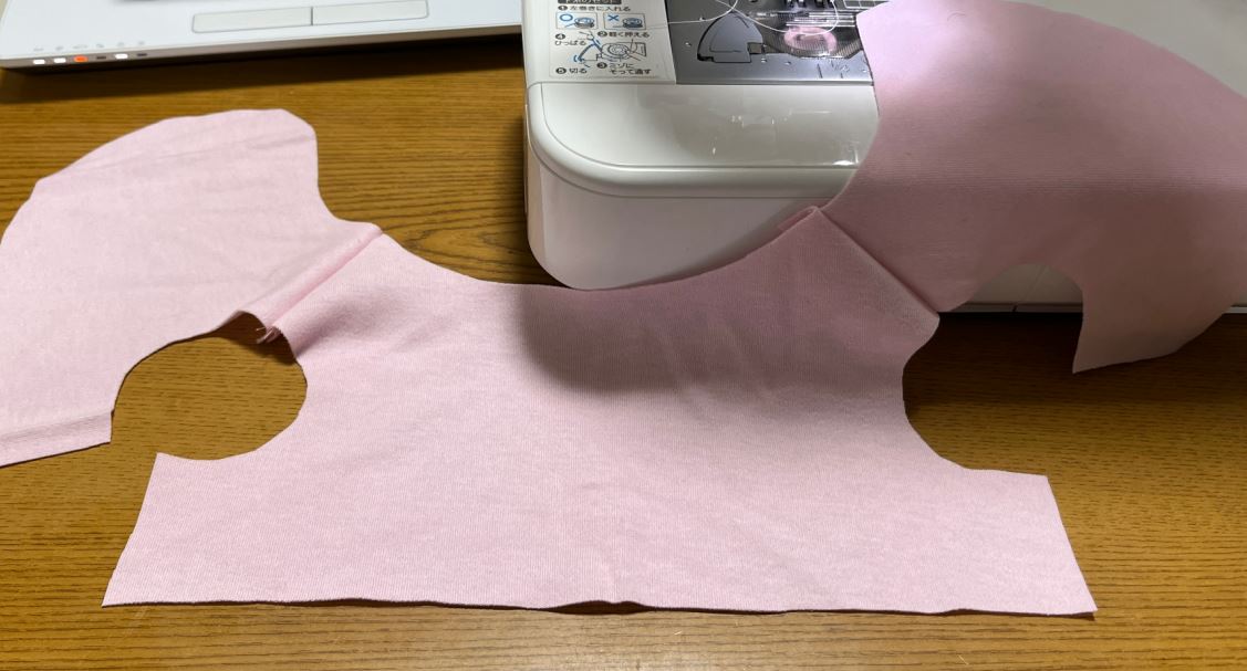 前身頃と後身頃の肩同士を中表にし、縫い代1cmでミシンを掛けます。