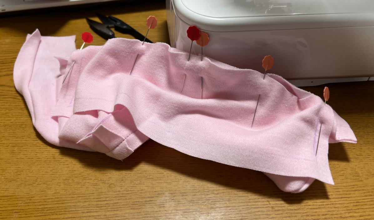 身頃のそで部分とそでを、中表にしてまち針で止めます。