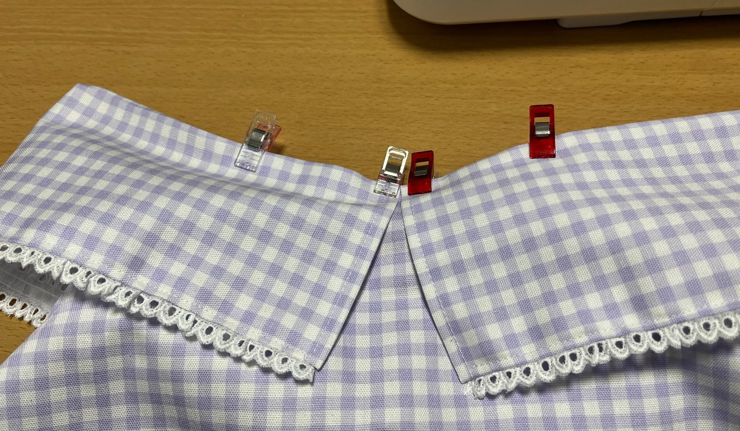 えりの中央のチャコペンに合わせてクリップをして下さい。